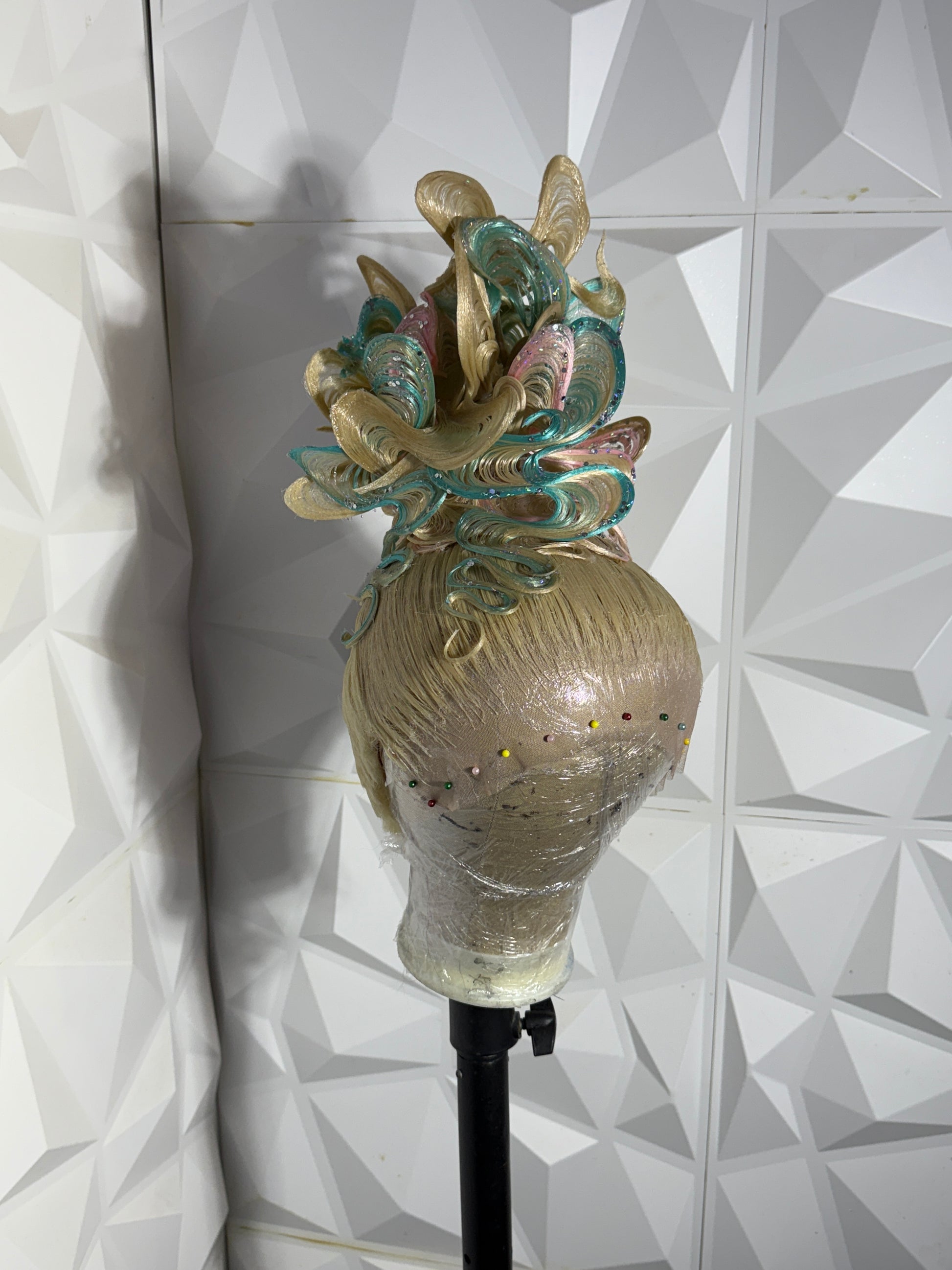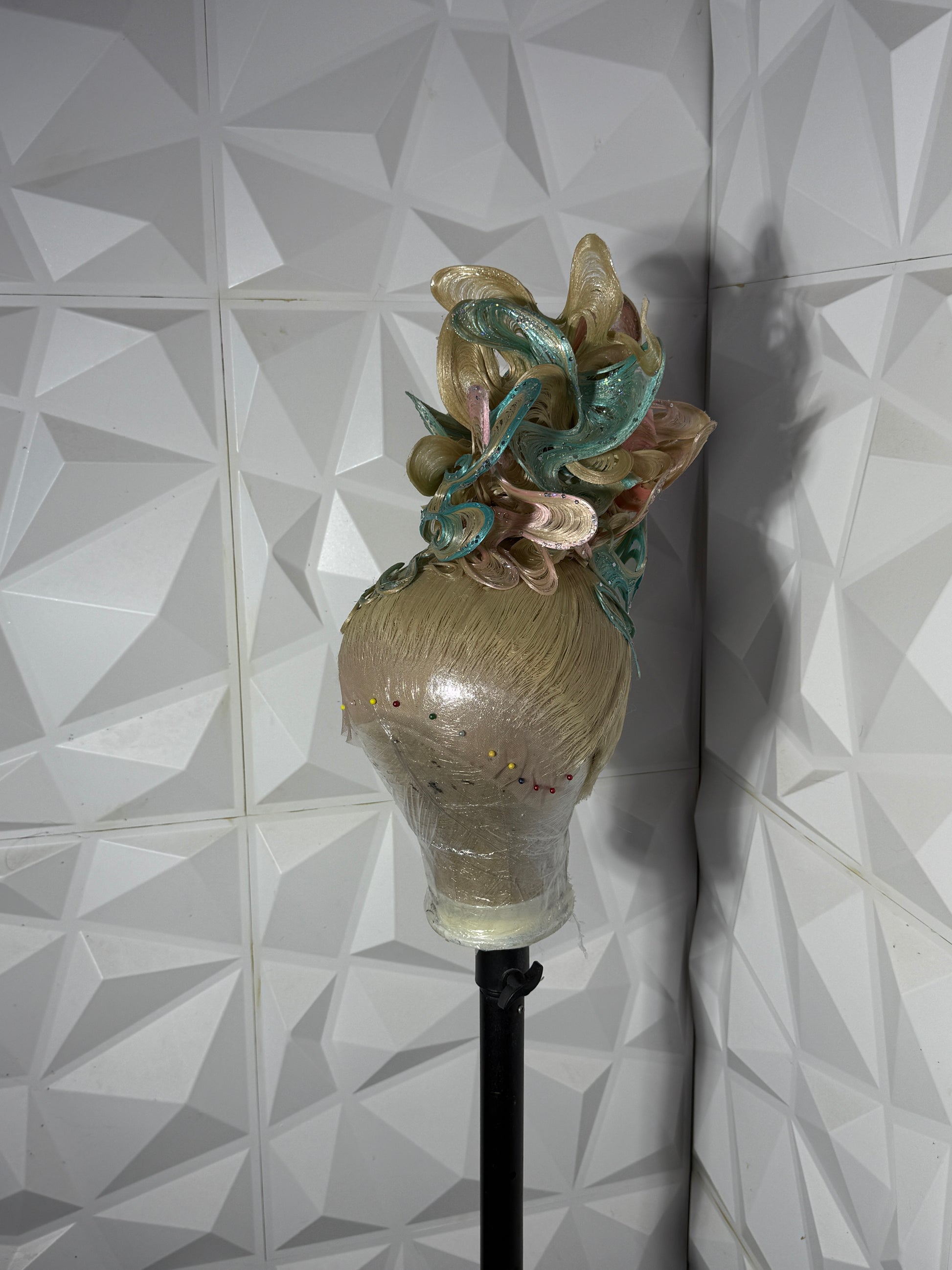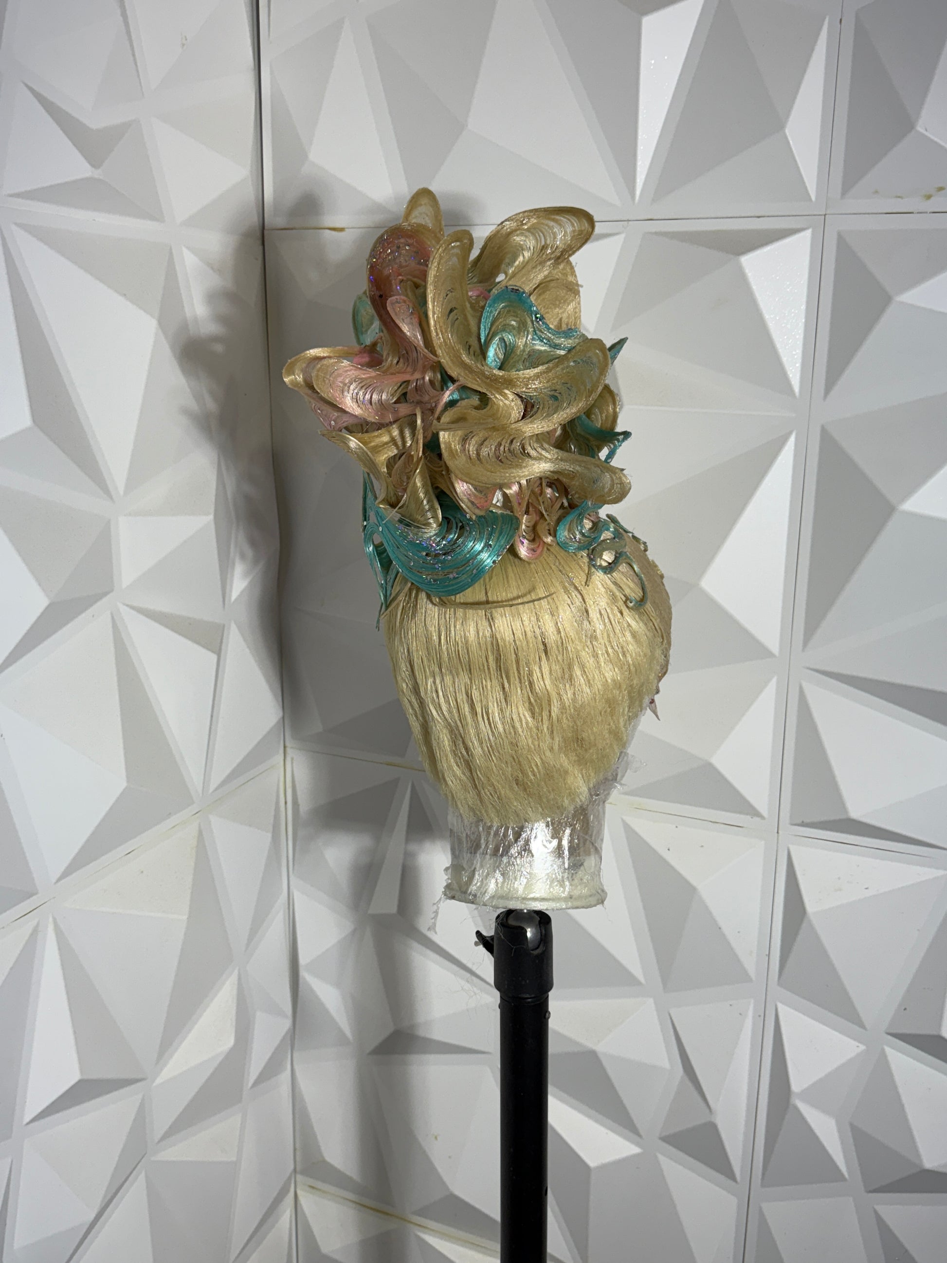Custom ventilated hairline, permastyled for a long lasting style, back hairline installed. Glitter painted throughout. Styled on a 24 inch mannequin head.